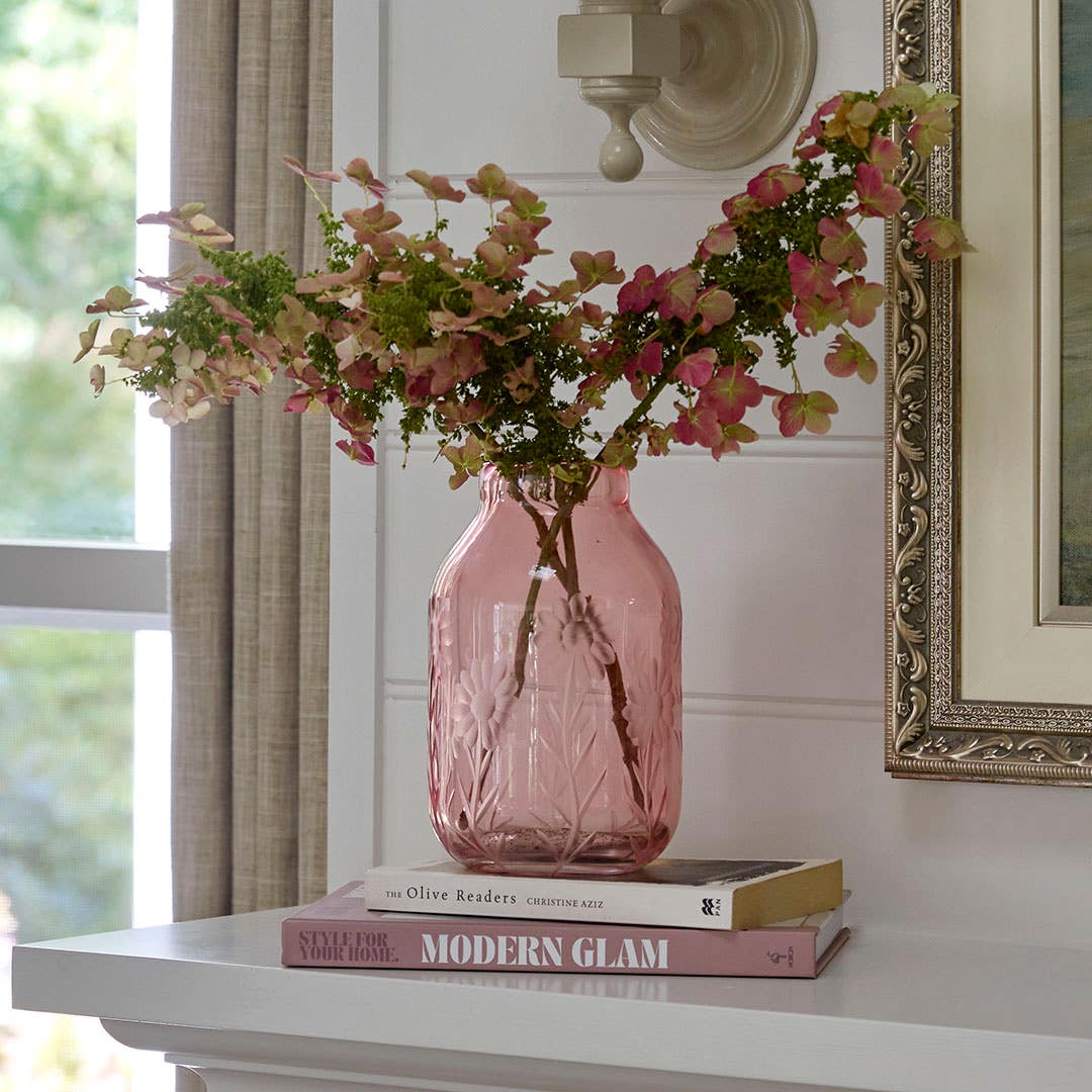 The Christa Floral Etched Glass Vase adds a soft, elegant touch to your decor with its gentle pink hue and delicate etched flower motifs. Its rounded shape and subtle transparency create a light, graceful look for displaying small arrangements. A charming piece that brings a hint of colour and warmth to any space.