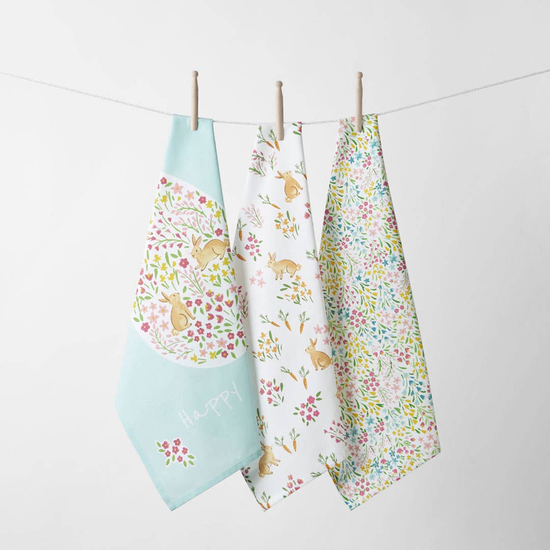 Brighten up your kitchen with the Ditsy Floral Bunny Tea Towel Set, featuring playful bunny illustrations nestled among delicate floral patterns. With a cheerful mix of pink, blue, and yellow, these tea towels add a fresh and lively touch to any space.