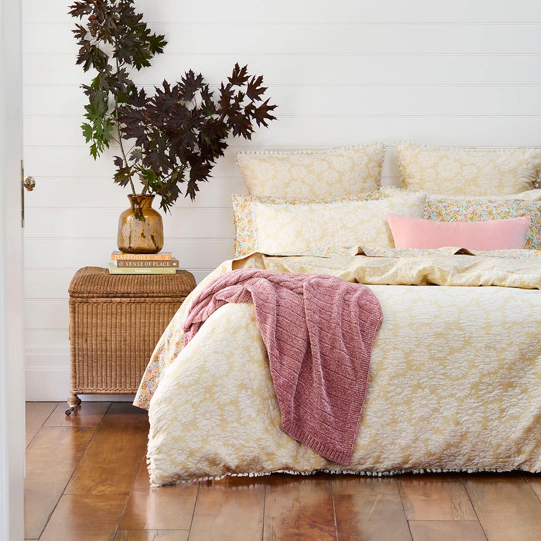 Bring fresh and fun florals into the bedroom with the Harriet quilt cover in yellow. Crafted from cotton in a jacquard weave, this quilt cover features an all-over design of textured daisies over a soft buttercup base. Finished with a floral print reverse and a playful tassel trim.