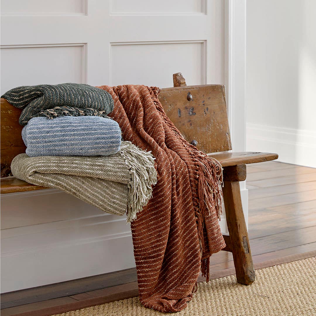 The Josie Throw in green brings refined texture and cosy warmth to your space with its elegant fine stripe design. Crafted from plush chenille with a lovely heavy weight, this throw blanket feels luxuriously soft and indulgent to the touch. Finished with relaxed tassel detailing, Josie drapes effortlessly over sofas and beds for elevated everyday styling.